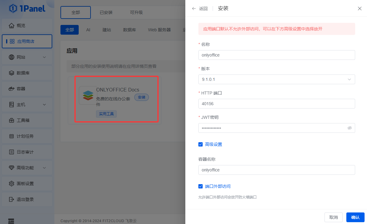 回到1Panel后台页面 -> 应用商店 -> 搜索 ONLYOFFICE , 安装。这里 JWT密钥要记录一下,后面需要用到。