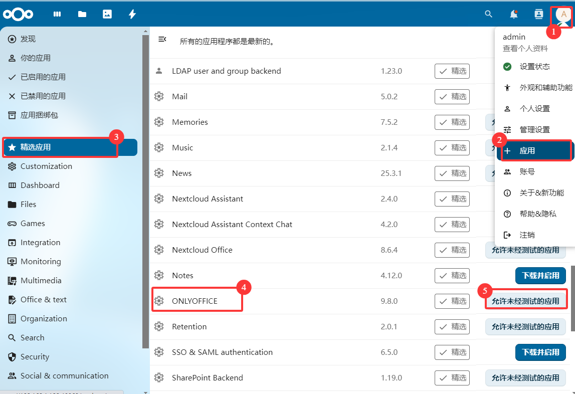 登录Nextcloud -> 点右上角头上 -> 应用 -> 进入应用页面后 左侧精选应用 -> 找到 ONLYOFFICE -> 点允许未经测试的应用安装,安装。