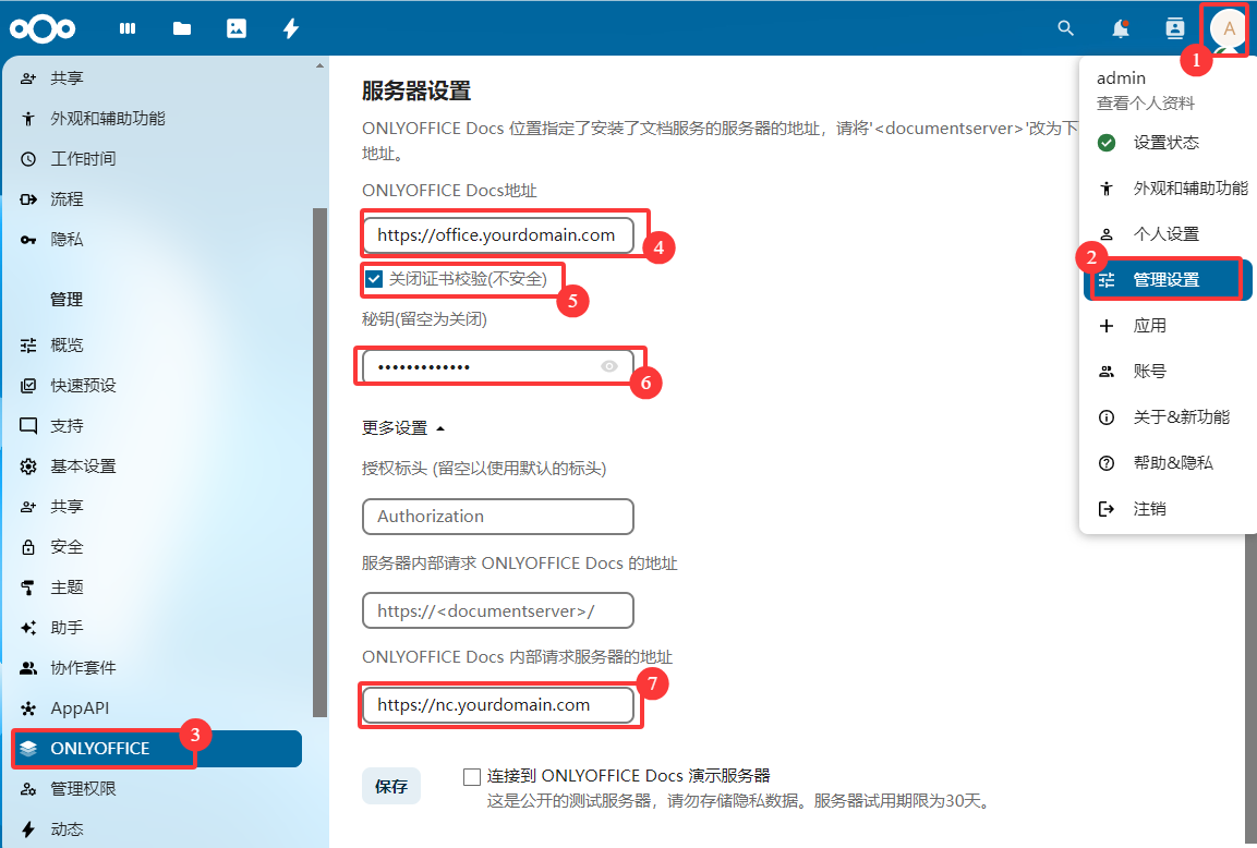 - ONLYOFFICE Docs 内部请求服务器的地址:NextCloud域名地址。