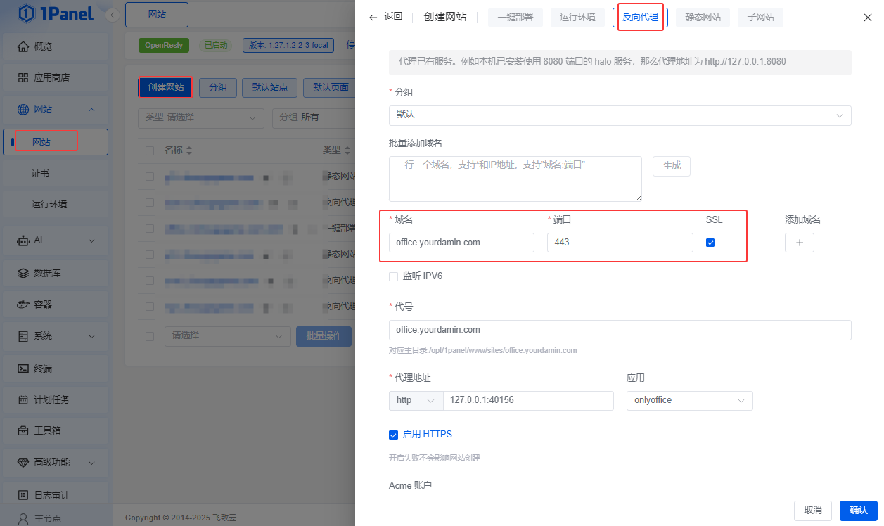 - 进入 网站 -> 创建网站 -> 返向代理。