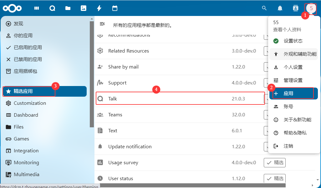 点右上角头像 -> 应用 -> 进入应用页面后,在左侧 精选应用 -> 找到 Talk ,选择安装。