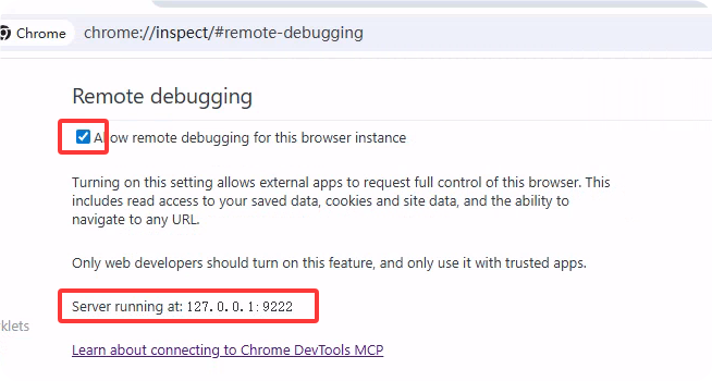 在浏览器中输入chrome://inspect/#remote-debugging, 勾选 Allow remote ... ,看到下面 Server running at 127.0.0.1:9222