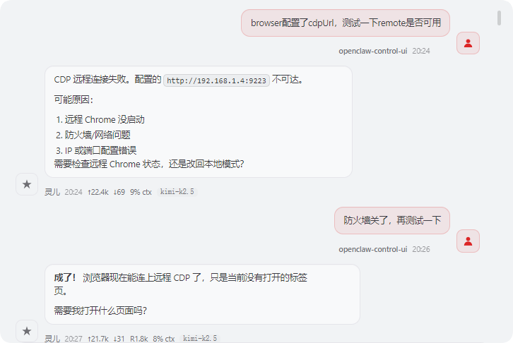 - 连接失败:检查 Windows Chrome 是否正确启动、防火墙是否放行、IP 是否写对。用 curl 测试连通性是最快的排查方式。
