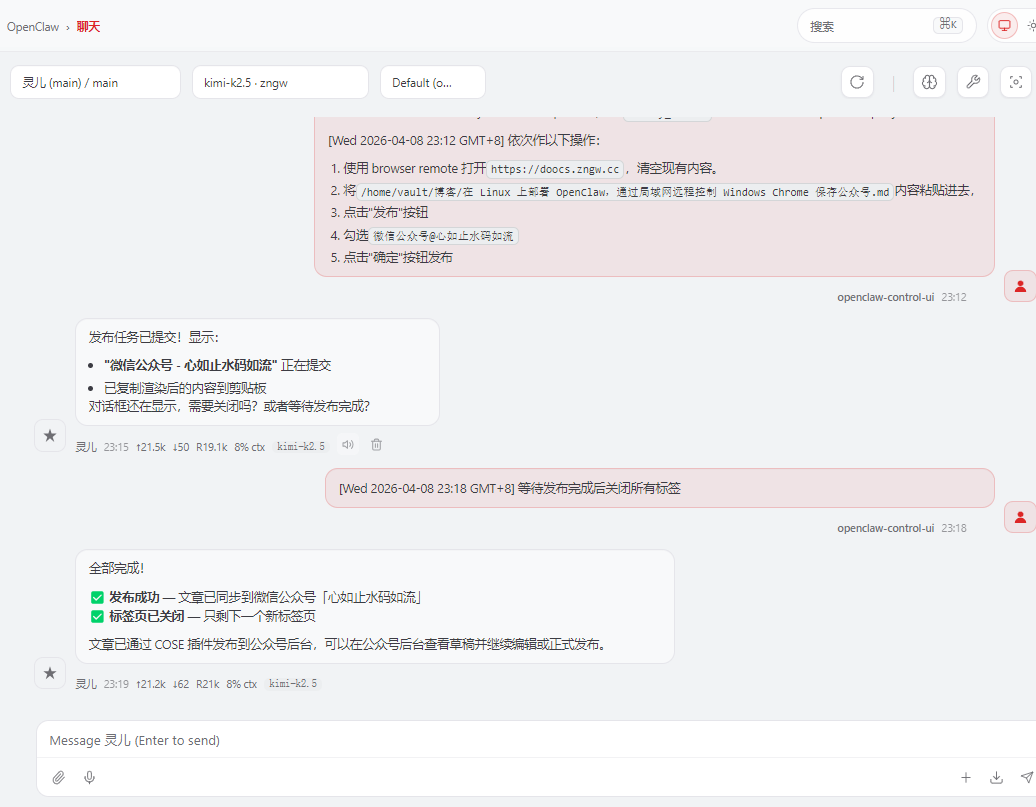 把这个Windows 上的 Chrome最小化挂在后台,OpenClaw 就会有一个完整的 Chrome,保留所有登录状态和 Cookie,可以正常查看数据、编辑文章、发布内容。也可以发布小红薯、头条等其他文章等。