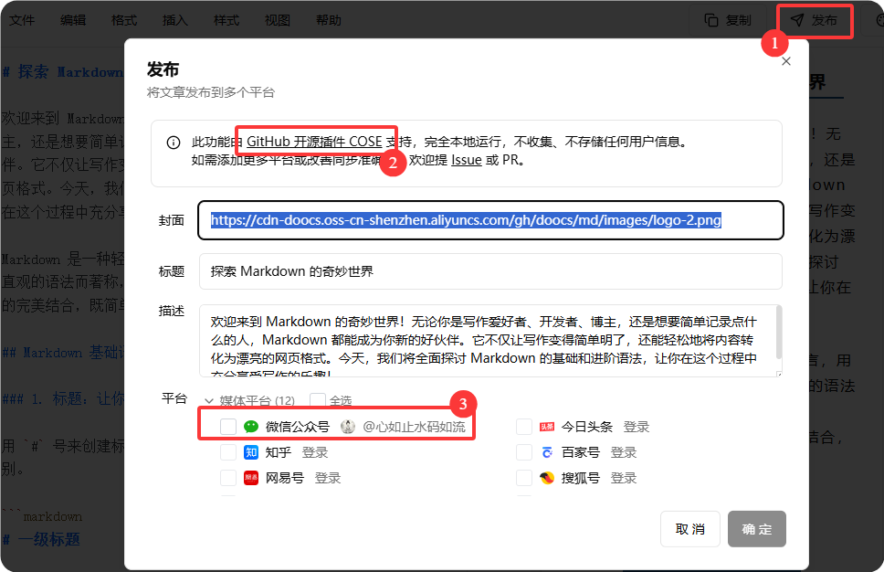 - 发表就是写入公众号的草稿中,会自动保存,等完成后关闭标签就可以了,然后手动审核一下草稿内容是否有问题,就可以发表了。