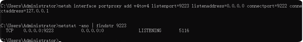 netsh interface portproxy add v4tov4 listenport=9223 listenaddress=0.0.0.0 connectport=9222 connectaddress=127.0.0.1