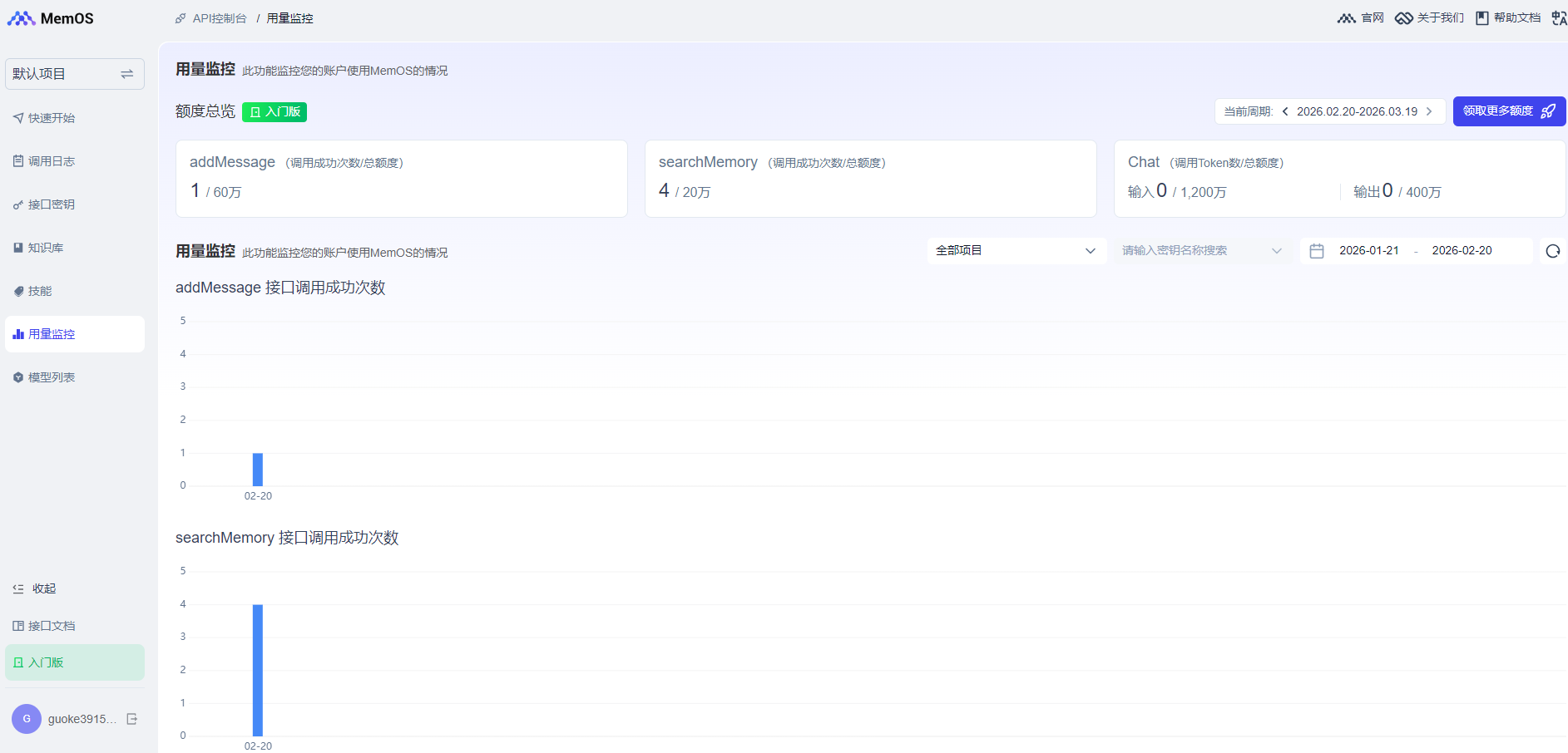 先去官网用邮箱注册获取一个API Key,现在免费使用,免费版2万次记忆查询,可以直接免费申请入门版20万次记忆查询,基本够用了。