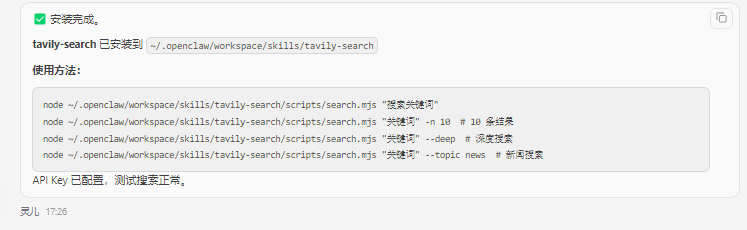 使用clawhub安装tavily-search,使用APIKey:tvly-dev-前面复制的Api Key