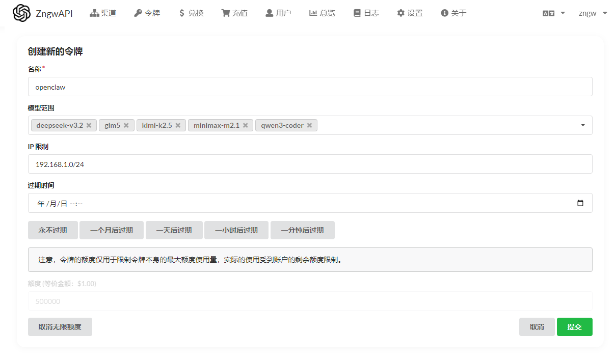 - 不设置过期时间和无限额度