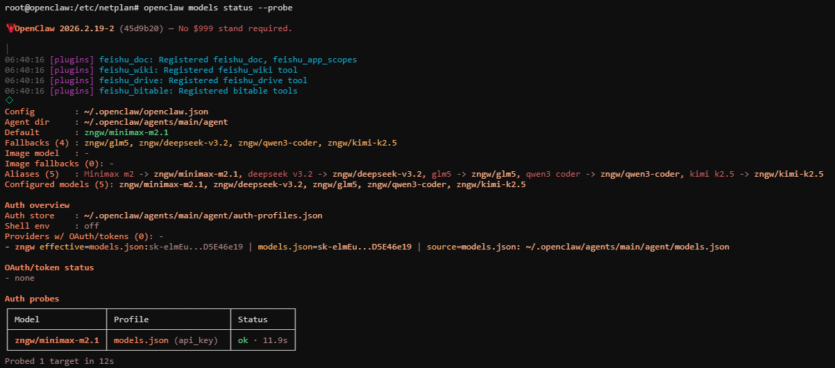 使用openclaw models status --probe测试模型是否成功