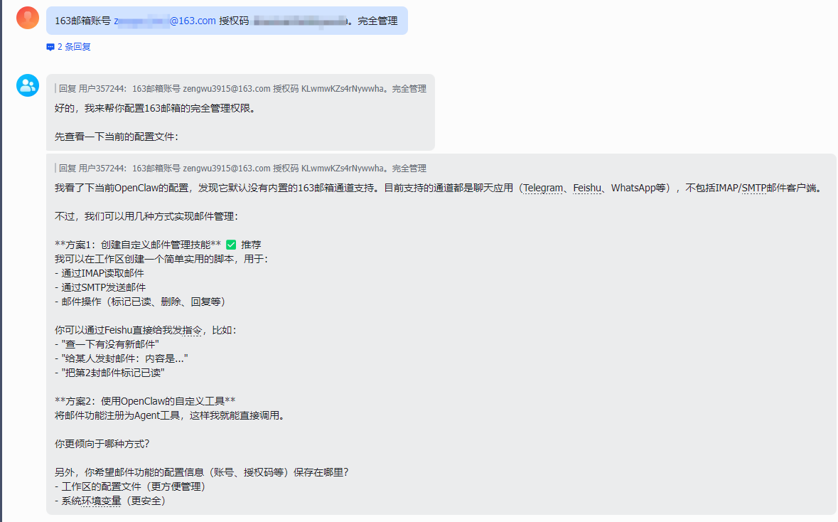 - 首先我询问OpenClaw怎么添加163的邮件,它给了我相关的操作步骤