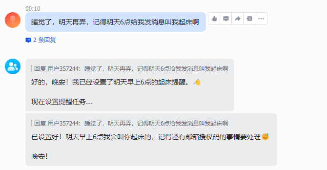 - 感觉时间有点晚了,过了12点了准备去睡觉,让它明天6点给我发消息提醒我起床。