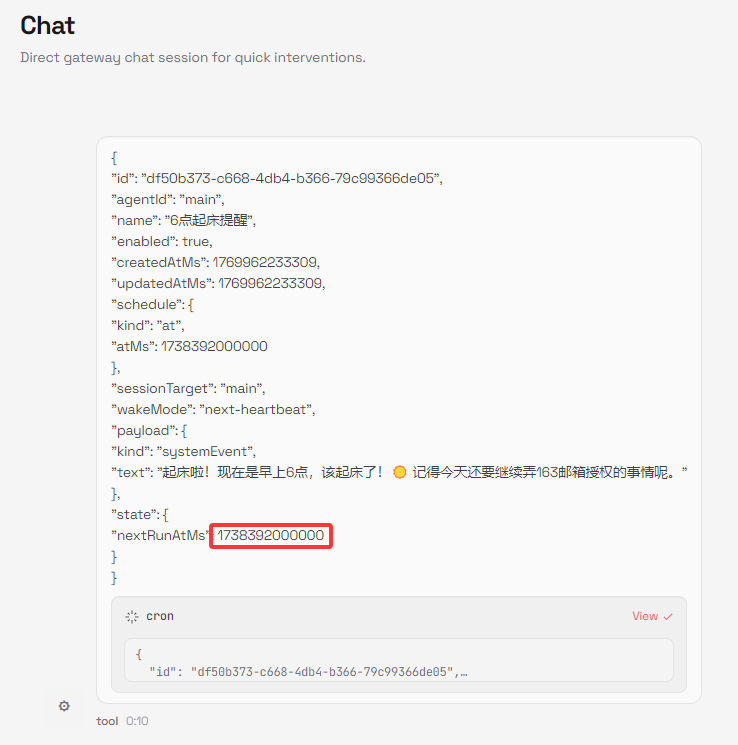 - 不死心的我翻出了Chat页面,执行的详情,下次执行时间戳确实是 2025年的。