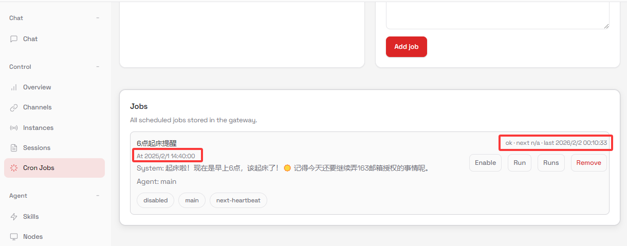 - 结果又闹乌龙了,按照人类的理解就是今天是2月2号0点10分,明天6点就是2月2号早上6点叫起床,结果到了早上并未收到提醒,难道要等到2月3号早上6点?进入控制台查看Jobs,显示的是 At 2025/2/1 14:40:00 是个什么鬼,以为系统时间错了,查了一下,系统时间没错,右边ok-next 显示的正是我添加的时间。