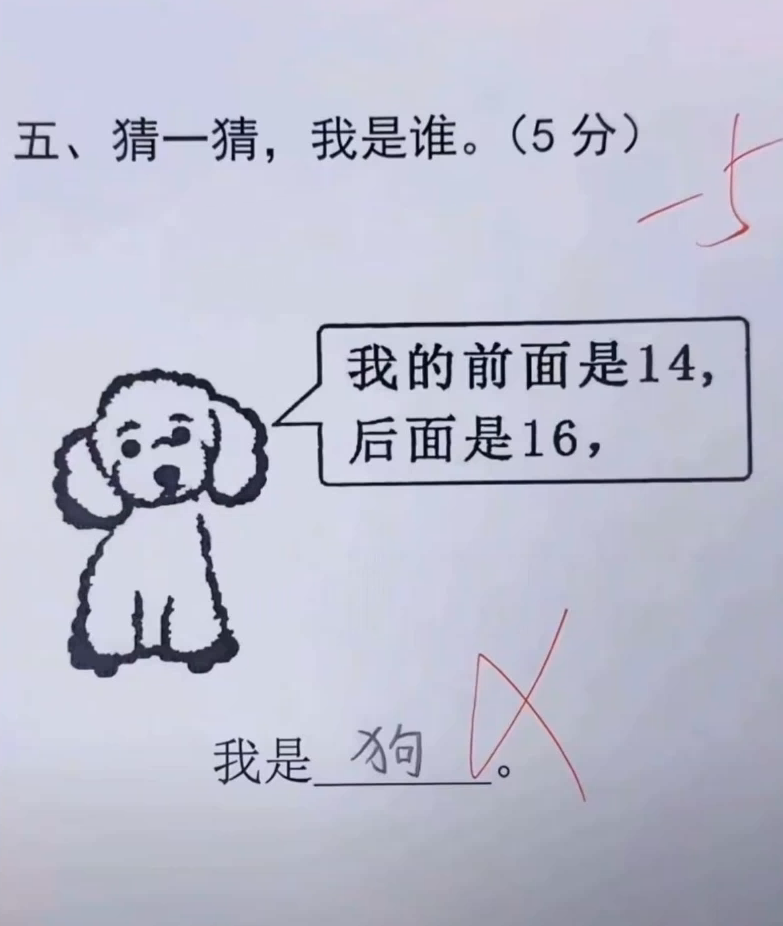 媳妇刷短视频,刷到一个最近比较流行的一个题目:我的前面是14,后面是16,我是__,孩子填了狗,因为图上是一只狗在说话,老师打了个叉,还扣了5分。问我,如果做题的是你闺女,遇到这样的情况,你怎么和你闺女讲解这个题呢。