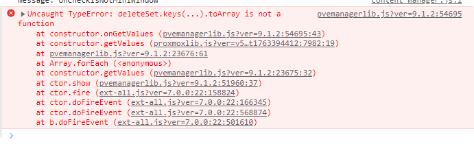 从报错信息来看,应该是前端js的兼容问题,在pvemanagerlib.js文件中出现了不兼容的语法deleteSet.keys().toArray()。这段的意思就是要将deleteSet set的key转成数组,改成兼容性强的语法Array.from(deleteSet.keys())就可以了。