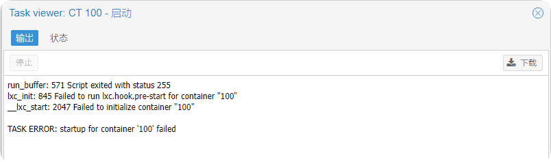 lxc.hook.pre-start脚本钩子导致的失败,因为有容器可能启动,肯定不是全局钩子。检查lxc100的配置,发现没有相关的配置,应该不是配置出问题了。
