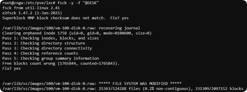 fsck -y -f "/var/lib/vz/images/100/vm-100-disk-0.raw"