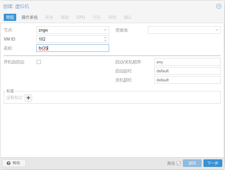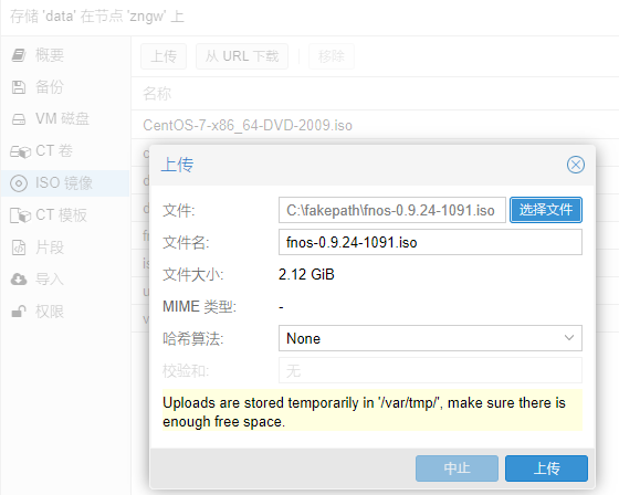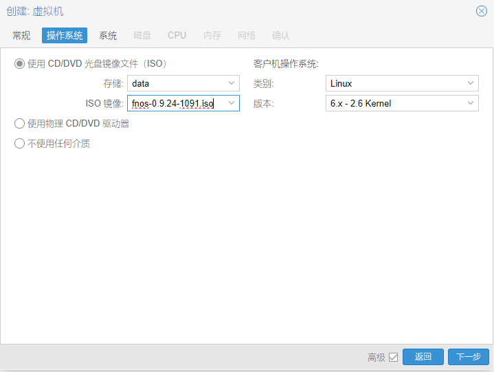 选择前面上传的飞牛nas镜像,因为是基于Debian的,所以系统选择Linux就行