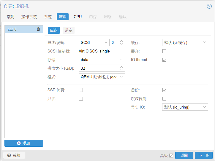 飞牛nas至少需要二块硬盘,我们先创建一个系统硬盘,后面的数据盘之后再添加。系统硬盘32G就差不多了(不考虑安装太多额外的应用的话,如果需要的话,后面再扩充也是可以的)。