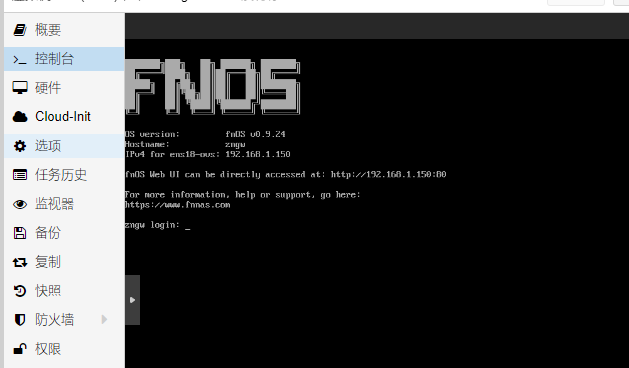 飞牛nas保留了ssh功能,在pve控制台中,用初始化时设置的账号密码登录。