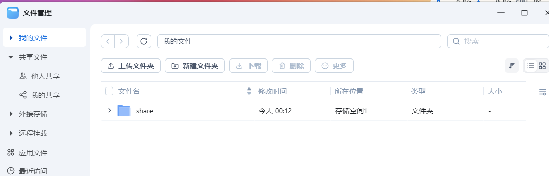 进入nas网页管理,就可以在zngw管理员的文件目录中看到share了,并且与pve主机的 /home/data文件是同步的。后面文件共享、影视、照片目录设置为这个share目录就可以了。