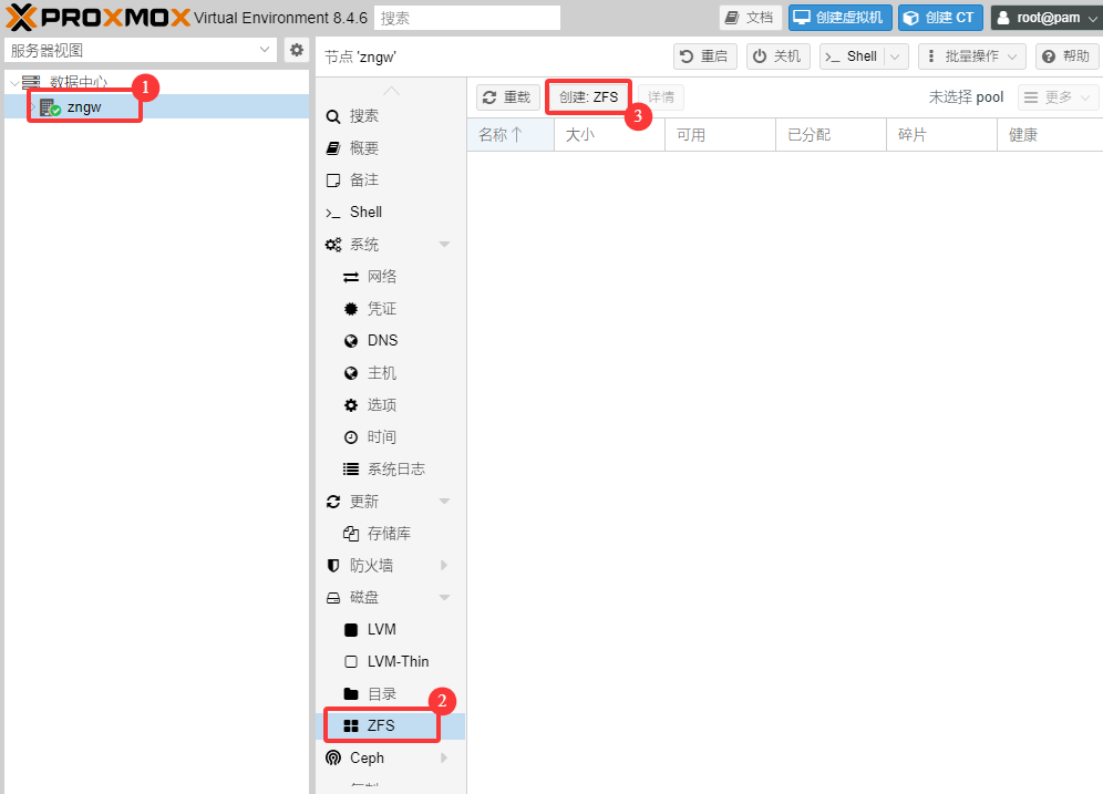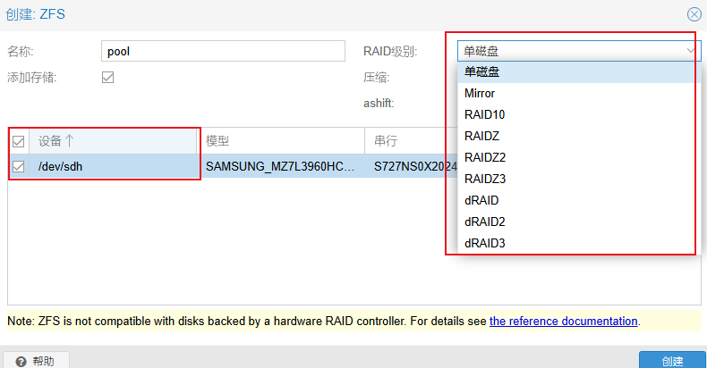 进入pve网页后台,选择节点中的ZFS,直接创建