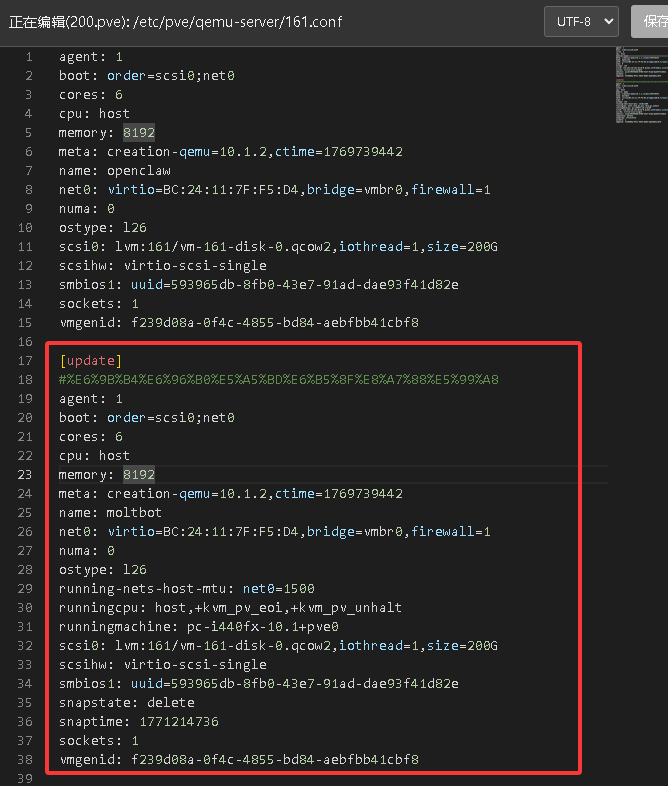 /etc/pve/qemu-server/161.conf,将整个 [update]段落(包括标题和下面几行)全部删除。