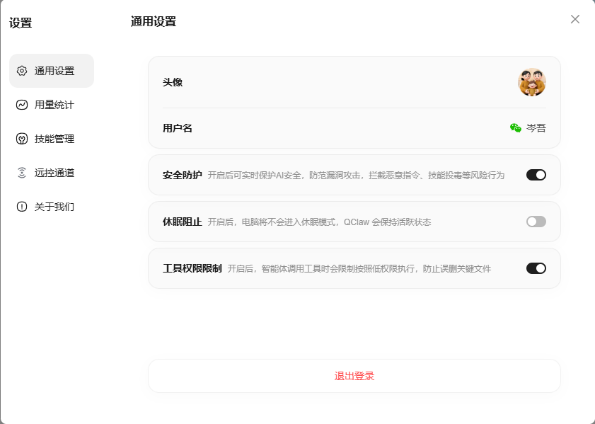 - 如果你是安装在工作电脑或个人电脑中,防止它误伤你的东西,可以把 工具权限限制打开,要让QClaw操作的文件和数据复制到它的工作空间中,处理远再复制走。