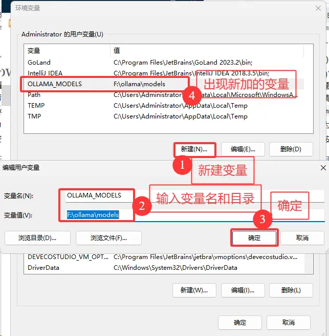在用户变量中添加OLLAMA_MODELS变量值