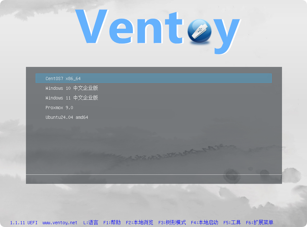 开机从U盘启动后,Ventoy 会自动列出所有 ISO 文件,选择需要启动的那个回车即可。