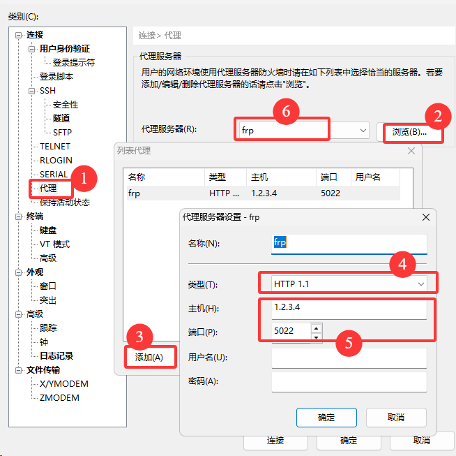 代理设置为HTTP,主机填写公网服务器的IP1.2.3.4,端口为5022,用户密码为空