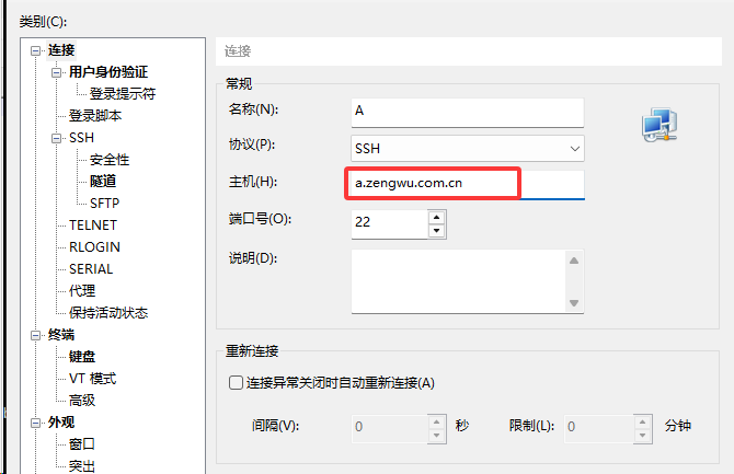 主机设置为a.zengwu.com.cn,端口为22