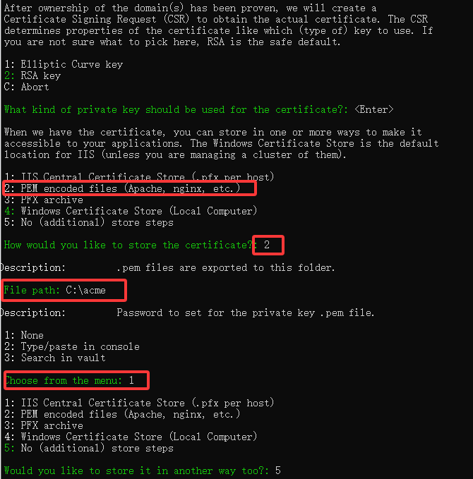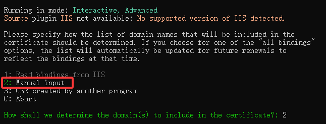 - 选择2手动配置,如果是为本地IIS配置证书的话,可以选择1自动导入。