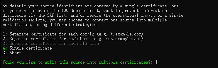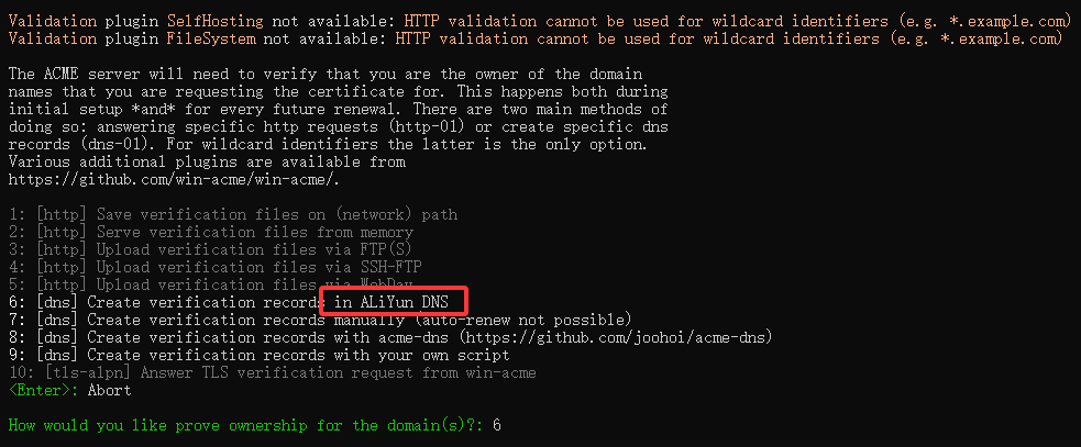 - 选项1使用DNS来验证,多域名或泛型域名的时候,只能用这个DNS来验证。