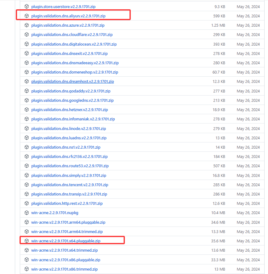 win-acme.v2.2.9.1791.x64.pluggable.zip,我这里用的是阿里云的DNS服务商,还需要下载一个阿里云插件,如果用了其它DNS服务商下载对应服务商的插件。