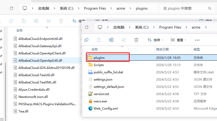 plugins插件目录,将plugin.validation.dns.aliyun.v.2.2.9.1701.zip中的dll文件解压到plugins目录。