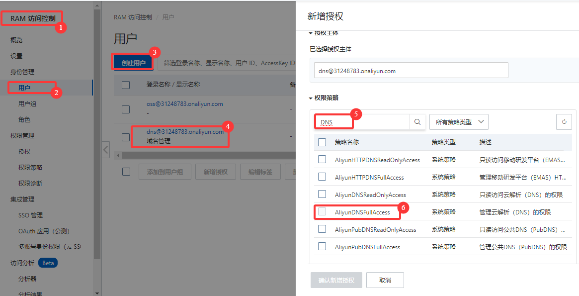 - 单独添加一个 dns管理用户,记录 AccessKey ID 和 Secret