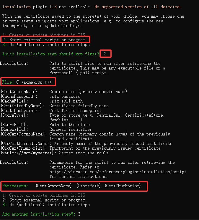 未传入参数时,需要配置 DEFAULT_PATH 和 DEFAULT_DOMAIN值,这二个参数也可以通过命令行参数传入。如: rdp.bat 域名 证书所在目录 证书指纹。 这个参数用于acme 自动调用时输入