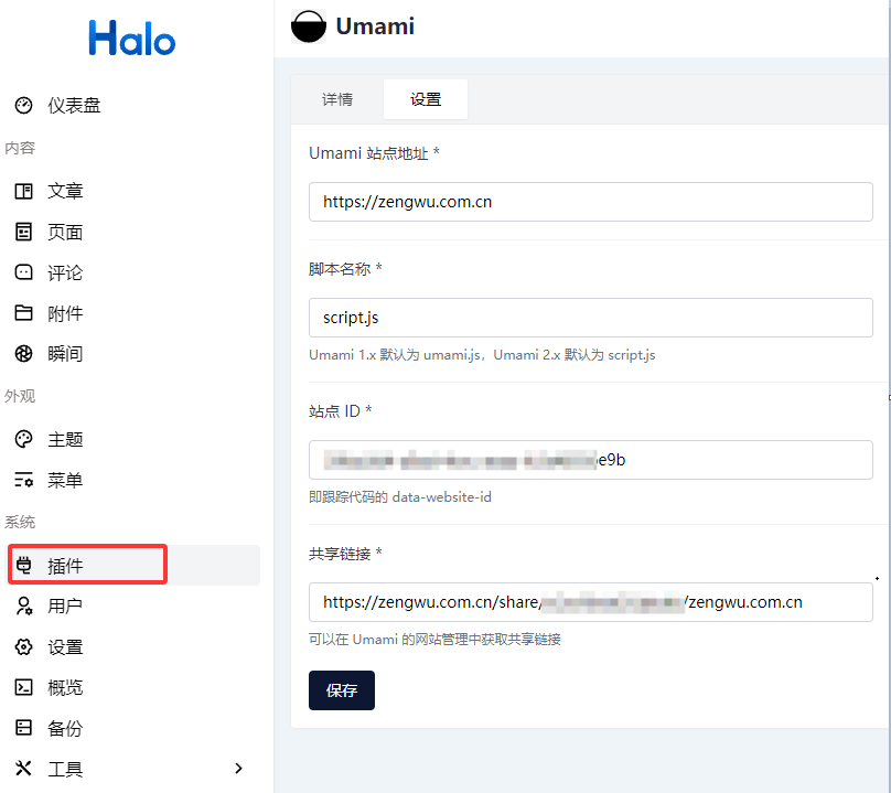 进入Halo后台,安装Umami插件,进入插件配置。填入上面记录的信息,保存