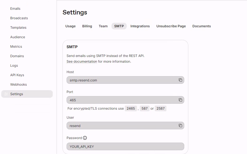 - 进入设置页面 -> SMTP,获取smtp信息,密码为api keys中记录的key。