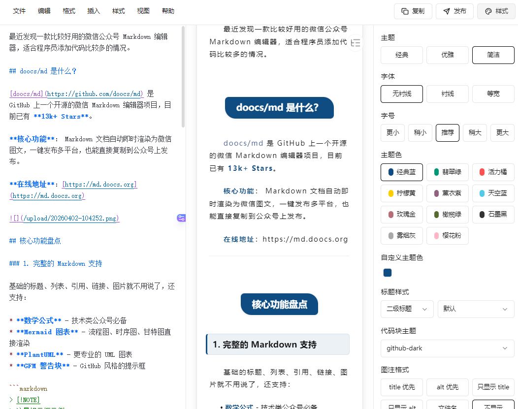 doocs/md 是 GitHub 上一个开源的微信 Markdown 编辑器项目,目前已有 13k+ Stars。
