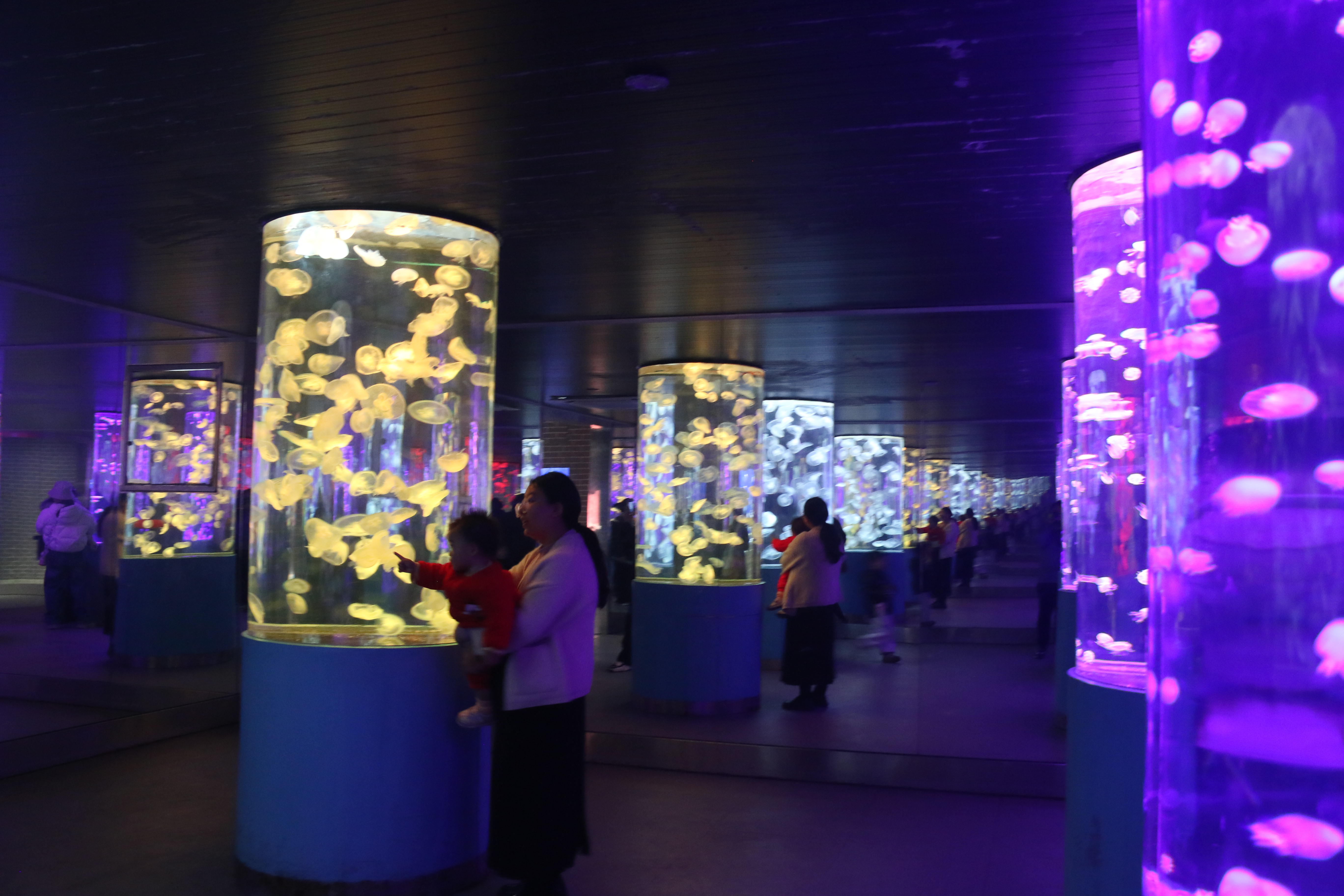 我们在“缤纷南美”看鹦鹉看猴子,在“萌宠乐园”看水母。不知道她是喜欢水母还是喜欢这里的灯光,在这赖了好久都不肯走。