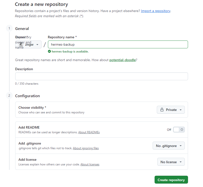 - 以GitHub为例,在上面创建一个空的私有仓库(如:hermes-backup),不勾选