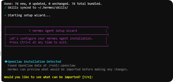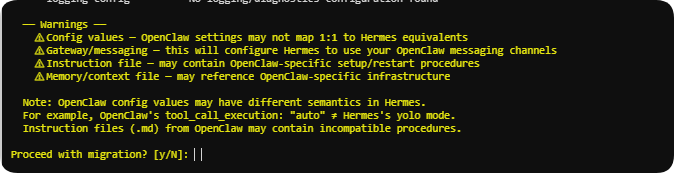 - 导入会有一些警告,毕竟OpenClaw 和 Hermes 的配置、指令、内存、工具执行方式有差异,这里会列出哪些导入哪些有警告需要手动调整等,然后才复制/转换,不会直接破坏原来的OpenClaw文件夹。输入Y继续迁移就可以了。