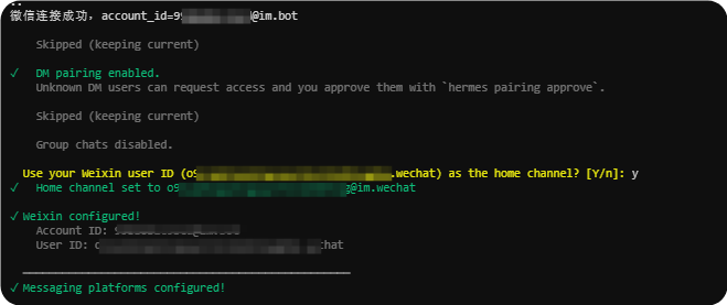 - 到此已经安装完成了,再回到微信,需要配对一下,这个和小龙虾一样,在命令行中输入匹配命令,之后就可以微信控制Hermes了。