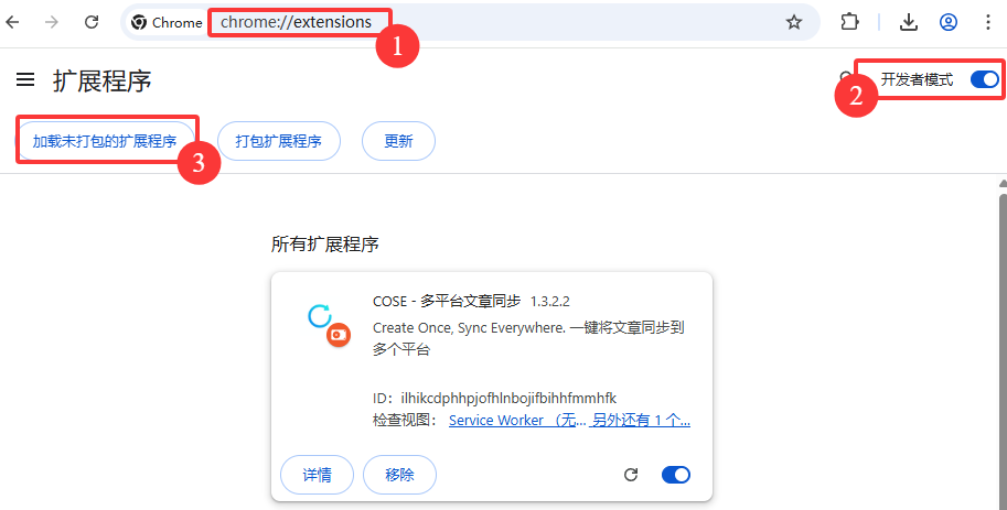 - 再进入chrome://extensions/开启开发者模式 -> 加载未打包的扩展程序