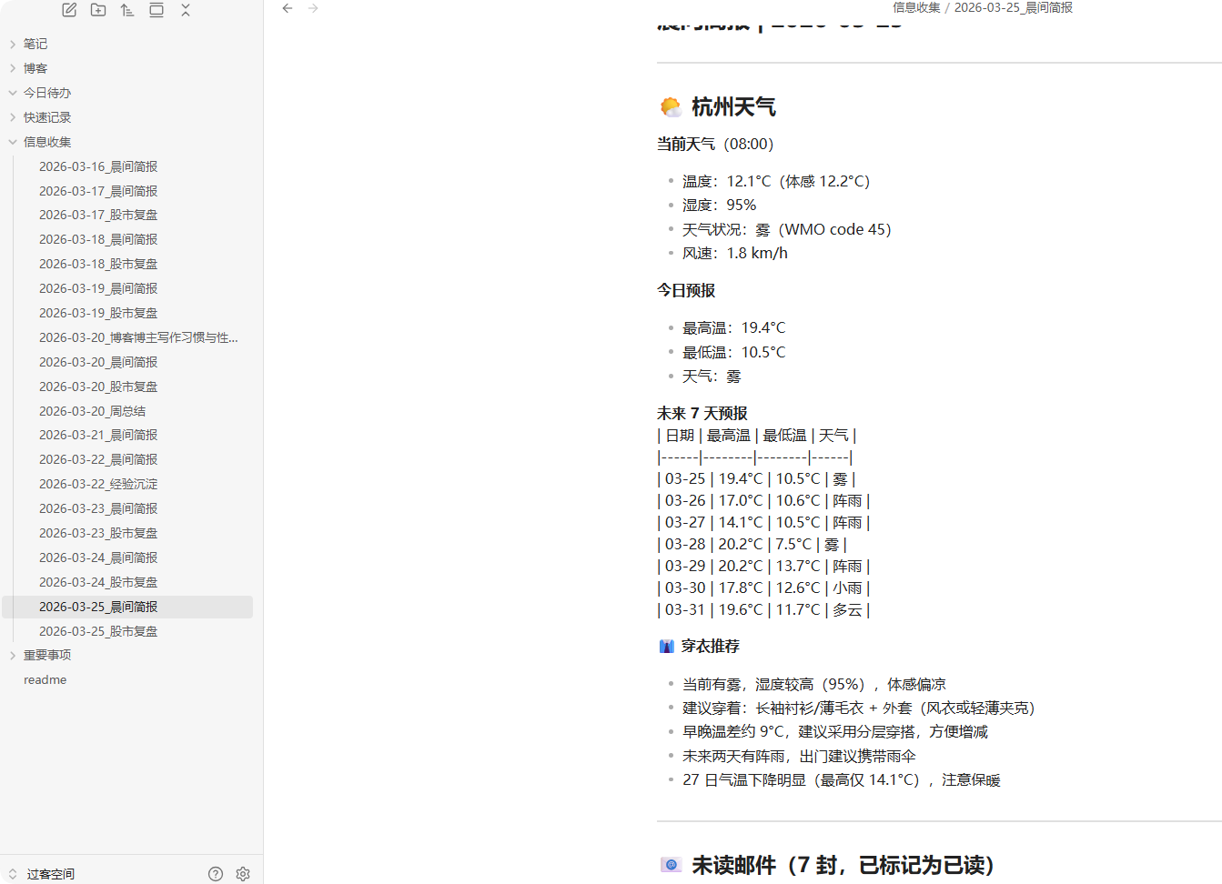 这样,每天8点就会生成一份有天气、邮件、新闻的简报发给你,还会在本地知识库中有备份,方便以后查看,如果还有其他关心的内容,也可以添加进去,它他整理一起发送。