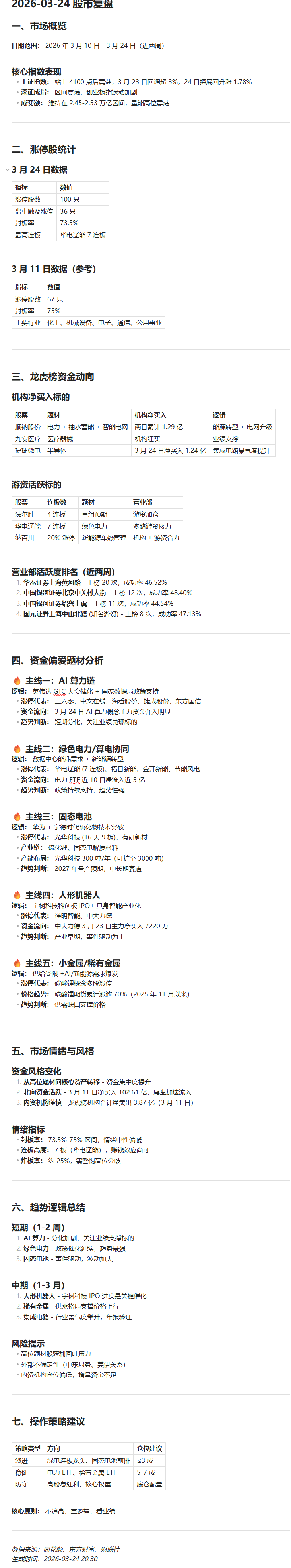 使用QVeris技能调用同花顺来分析一下最近二周 A 股涨停股及龙虎榜,分析一下资金最近偏爱的题材及趋势逻辑。将分析结果整理成简洁的日报格式,将分析的数据保存到本地知识库`/home/vault/信息收集/目录中`,文件名格式为 `日期_股市复盘.md`(示例:2026-03-16_股市复盘.md,日期与文字之间无空格)。若文件已存在,则在文件末尾追加内容。