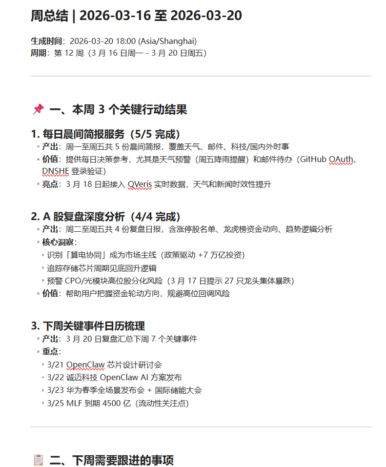 **额外任务**:将周总结内容保存到知识库 `/home/vault/信息收集/` 目录中,文件名格式为 `日期_周总结.md`(示例:2026-03-21_周总结.md)。若文件已存在,则在文件末尾追加内容。